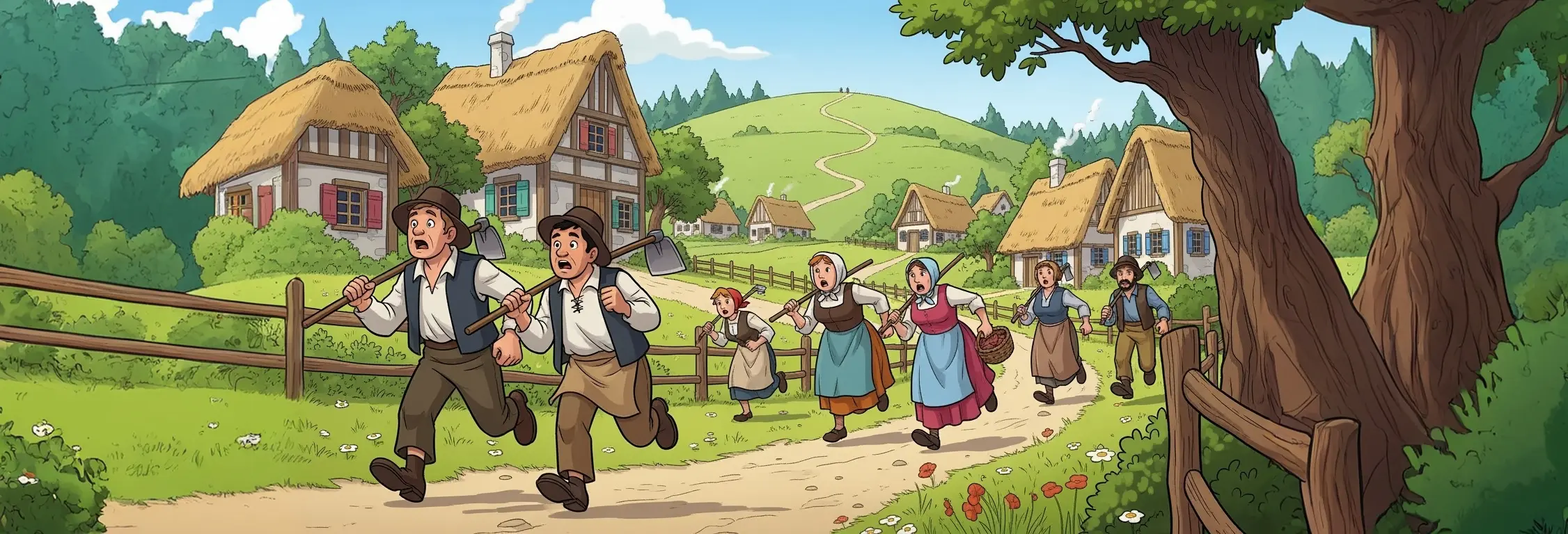 村民們丟下手中的工具,急忙跑上山。他們拿著棍子,大聲喊著:「狼在哪裡?」但當他們趕到時,只看到安靜吃草的羊群。男孩放聲大笑,說:「我騙你們的!根本沒有狼!」村民們搖搖頭,警告他不要說謊。